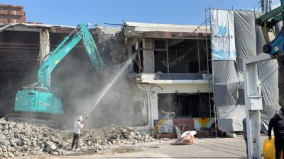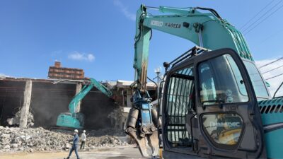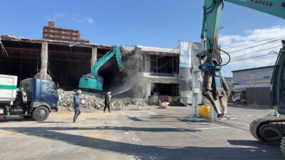 現場では重機を使用しながら、建物の構造を確認しつつ段階的に作業を進めています。